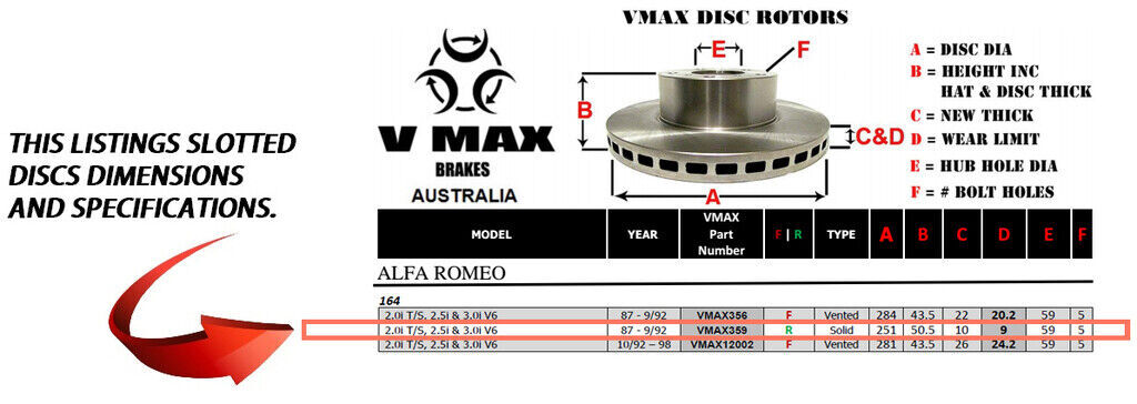 This sale is for a new pair (2 disc rotors) of Genuine VMAX Dimple Drilled & Slotted Performance Rear disc brake rotors to suit ALFA ROMEO 164 2.0i T S 2.5i 3.0i V6 models built 1987 till 1992 and are a direct replacement item.