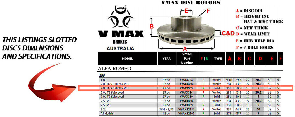 This sale is for a new pair (2 disc rotors) of Genuine VMAX Dimple Drilled & Slotted Performance Rear disc brake rotors to suit ALFA ROMEO 156 2.0L iT S 3.0i 24V V6 models built 1997 Onwards and are a direct replacement item.