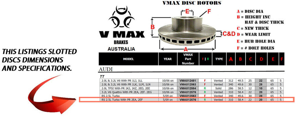 This sale is for a new pair (2 disc rotors) of Genuine VMAX Dimple Drilled & Slotted Performance Rear disc brake rotors to suit AUDI TT RS 2.5L Turbo With PR 2EA 2EF models built 2009 Onwards and are a direct replacement item.
