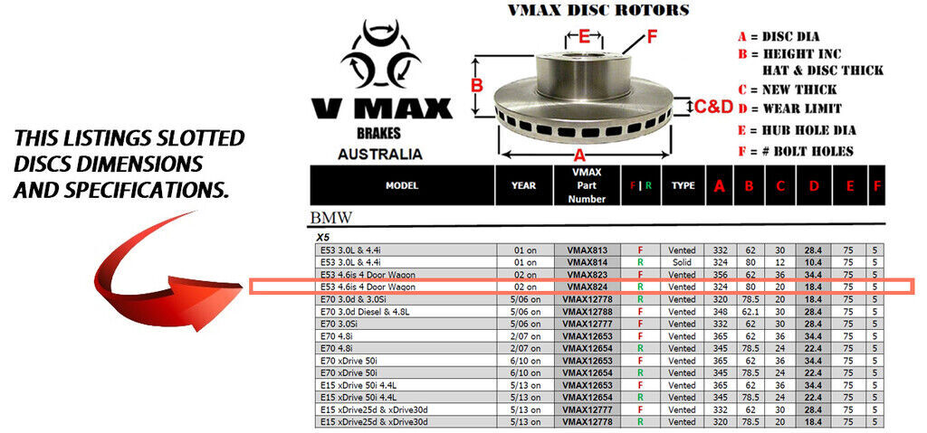 This sale is for a new pair (2 disc rotors) of Genuine VMAX Dimple Drilled & Slotted Performance Rear disc brake rotors to suit BMW X5 E53 4.6is 4 Door Wagon models built 2002 Onwards and are a direct replacement item.
