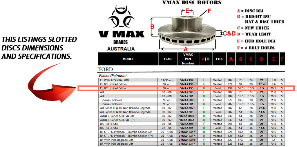 This sale is for a new pair (2 disc rotors) of Genuine VMAX Dimple Drilled & Slotted Performance Rear disc brake rotors to suit FORD Falcon EL GT Limited Edition models built 1997 Onwards and are a direct replacement item.