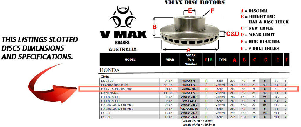 This sale is for a new pair (2 disc rotors) of Genuine VMAX Dimple Drilled & Slotted Performance Rear disc brake rotors to suit HONDA Civic EU 1.7L SOHC 4/5 Door models built 2001 Onwards and are a direct replacement item.