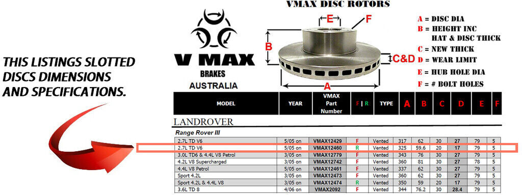 This sale is for a new pair (2 disc rotors) of Genuine VMAX Dimple Drilled & Slotted Performance Rear disc brake rotors to suit LANDROVER Range Rover III 2.7L TD V6 models built 2005 Onwards and are a direct replacement item.