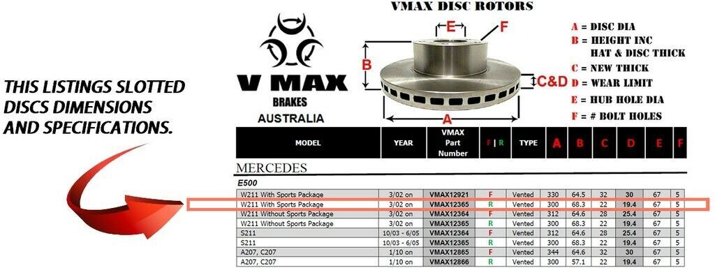This sale is for a new pair (2 disc rotors) of Genuine VMAX Dimple Drilled & Slotted Performance Rear disc brake rotors to suit MERCEDES E500 W211 With Sports Package models built 2002 Onwards and are a direct replacement item.