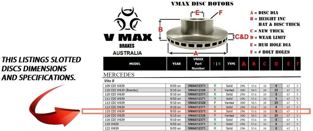 This sale is for a new pair (2 disc rotors) of Genuine VMAX Dimple Drilled & Slotted Performance Rear disc brake rotors to suit MERCEDES Vito II 115 CDI W639 models built 2003 Onwards and are a direct replacement item.