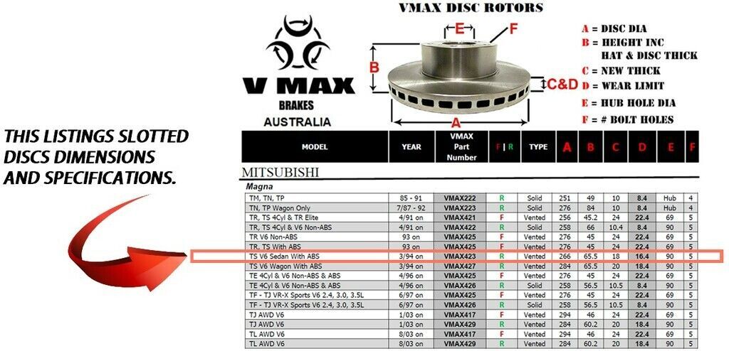 This sale is for a new pair (2 disc rotors) of Genuine VMAX Dimple Drilled & Slotted Performance Rear disc brake rotors to suit MITSUBISHI Magna TS V6 Sedan With ABS models built 1994 Onwards and are a direct replacement item.