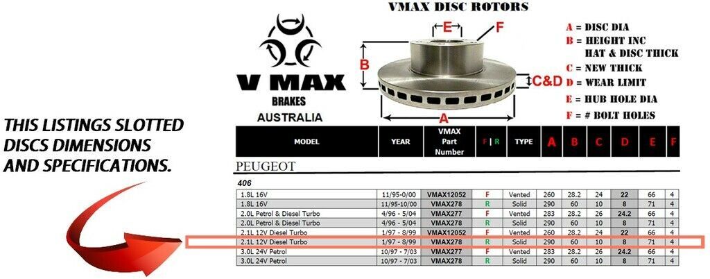 This sale is for a new pair (2 disc rotors) of Genuine VMAX Dimple Drilled & Slotted Performance Rear disc brake rotors to suit PEUGEOT 406 2.1L 12V Diesel Turbo models built 1997 till 1999 and are a direct replacement item.