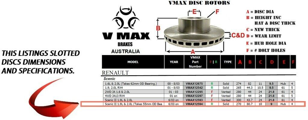 This sale is for a new pair (2 disc rotors) of Genuine VMAX Dimple Drilled & Slotted Performance Rear disc brake rotors to suit RENAULT Scenic II 1.9L 2.0L Take 55mm OD Brg models built 2003 Onwards and are a direct replacement item.