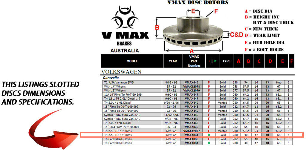 This sale is for a new pair (2 disc rotors) of Genuine VMAX Dimple Drilled & Slotted Performance Rear disc brake rotors to suit VOLKSWAGEN Caravelle T4 2.5L TDi 15" Rims models built 1996 Onwards and are a direct replacement item.