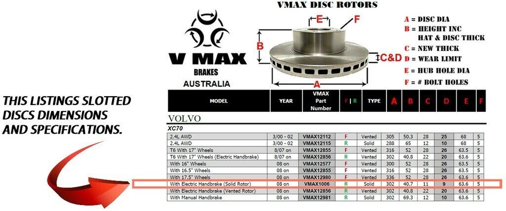 This sale is for a new pair (2 disc rotors) of Genuine VMAX Dimple Drilled & Slotted Performance Rear disc brake rotors to suit VOLVO XC70 With Electric Handbrake Solid Rotor models built 2008 Onwards and are a direct replacement item.